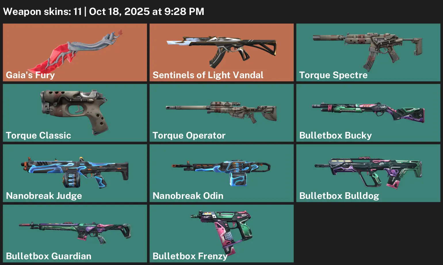 🌖 EU 🥍 Unranked 💿 11 Skins 🫗 545 VP 🔗 5 Agents 🦙 Value: 5725 VP 🍩 Gaia's Fury 🚣 Sentinels of Light Vandal 🥁 Torque Spectre ✊ Torque Classic 🏣 Torque Operator 😰 Bulletbox Bucky
