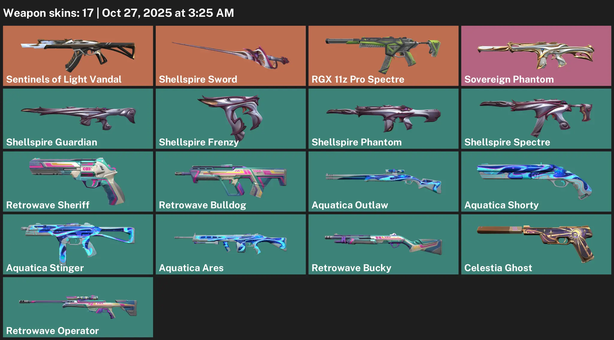 🪚 EU 😄 Unranked 🎻 17 Skins 🤼 55 VP 🫦 13 Agents 🧊 Value: 6125 VP 🍧 Sentinels of Light Vandal 🍵 Shellspire Sword ⛏ RGX 11z Pro Spectre 🎮 Sovereign Phantom 🐁 Shellspire Guardian 🚄 Shellspire Frenzy
