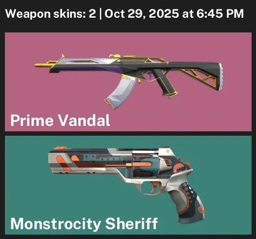 🧲 EU 🔦 Unranked 🌠 2 Skins 🪿 61 VP ☝️ 22 Agents 🔖 Value: 1775 VP 🏎 Prime Vandal ✋ Monstrocity Sheriff