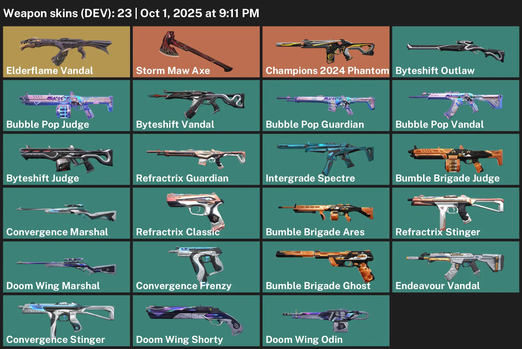 🚢 EU 🏵 Unranked ⚾️ 23 Skins 🪠 30 VP 🗄 11 Agents 🫔 Value: 6900 VP 😦 Elderflame Vandal ⛸ Storm Maw Axe 🧳 Champions 2024 Phantom 💰 Byteshift Outlaw 🌂 Bubble Pop Judge 🦇 Byteshift Vandal