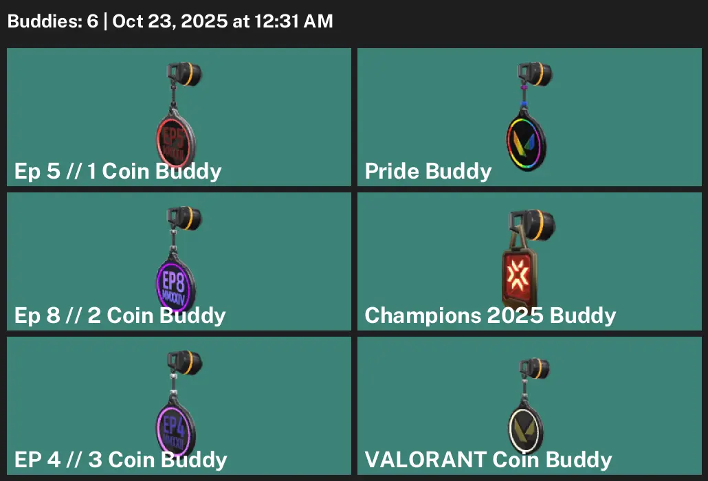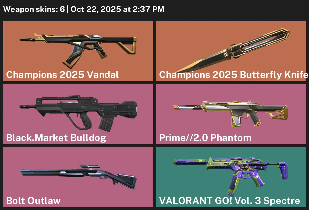 🪘 NA 👗 Unranked 🌵 6 Skins 🏆 195 VP 🩳 2 Agents 👈 Value: 14625 VP 😭 Champions 2025 Vandal 🐿 Champions 2025 Butterfly Knife 🏂 Black.Market Bulldog 🪇 Prime//2.0 Phantom 🦤 Bolt Outlaw 💶 VALORANT GO! Vol. 3 Spectre
