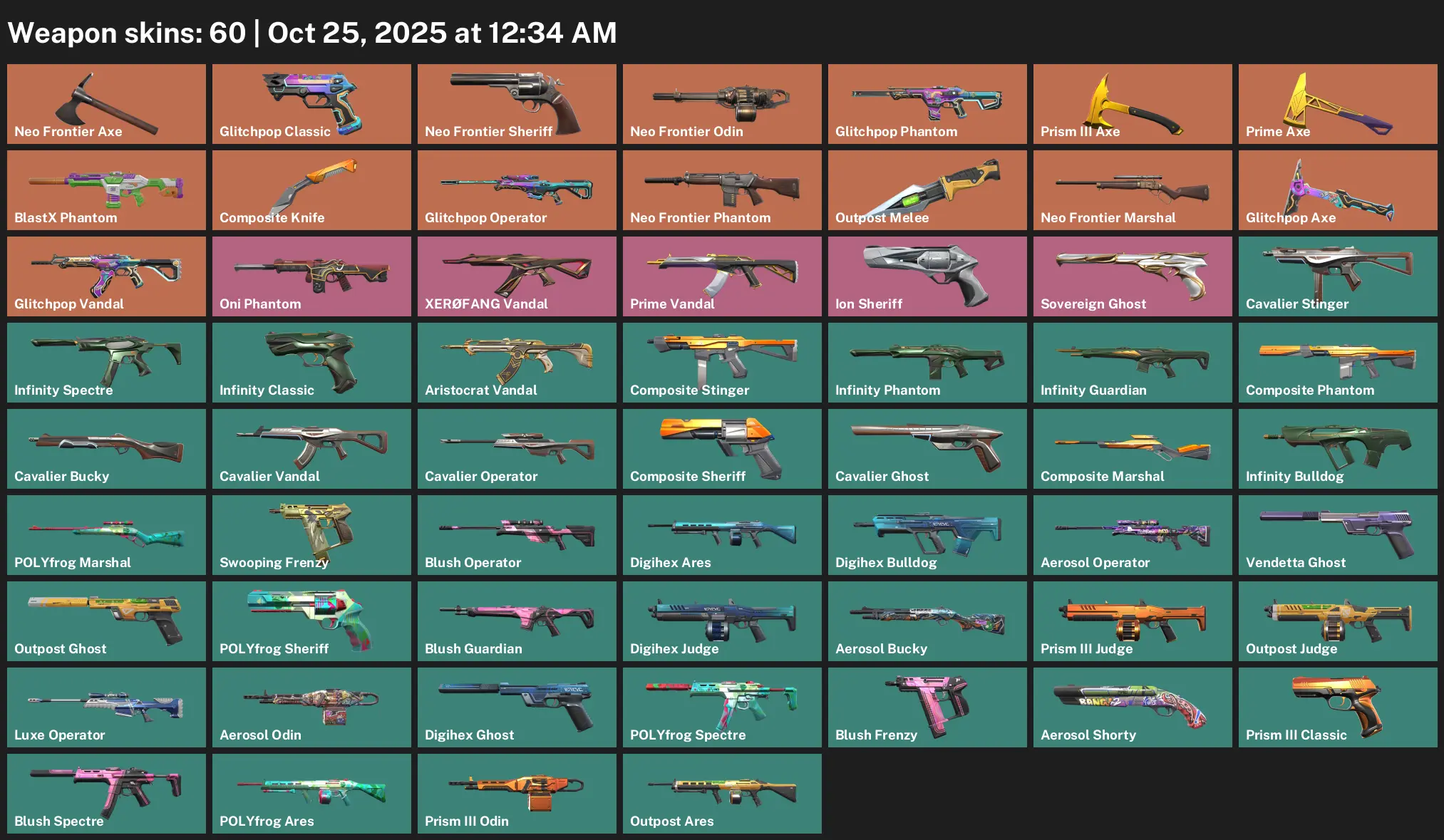 💩 NA ☘️ Unranked 📮 60 Skins 🗄 444 VP 🎀 18 Agents 🥹 Value: 42850 VP 🙏 Neo Frontier Axe 🦦 Glitchpop Classic 🏑 Neo Frontier Sheriff 🪤 Neo Frontier Odin 🚎 Glitchpop Phantom 🧽 Prism III Axe
