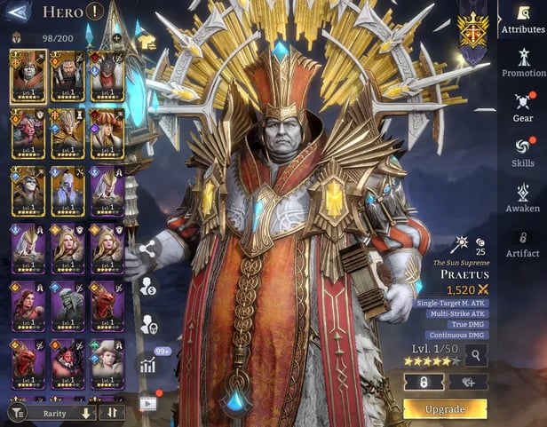 每位英雄都属于一个具有独特技能的特定职业,并且在面对不同类型的敌人时,团队组合非常重要。游戏设有进阶系统,英雄可以升级、升阶并装备装备以提升战斗力。玩家通过活动战斗、日常任务和特别活动收集资源来强化他们的阵容。